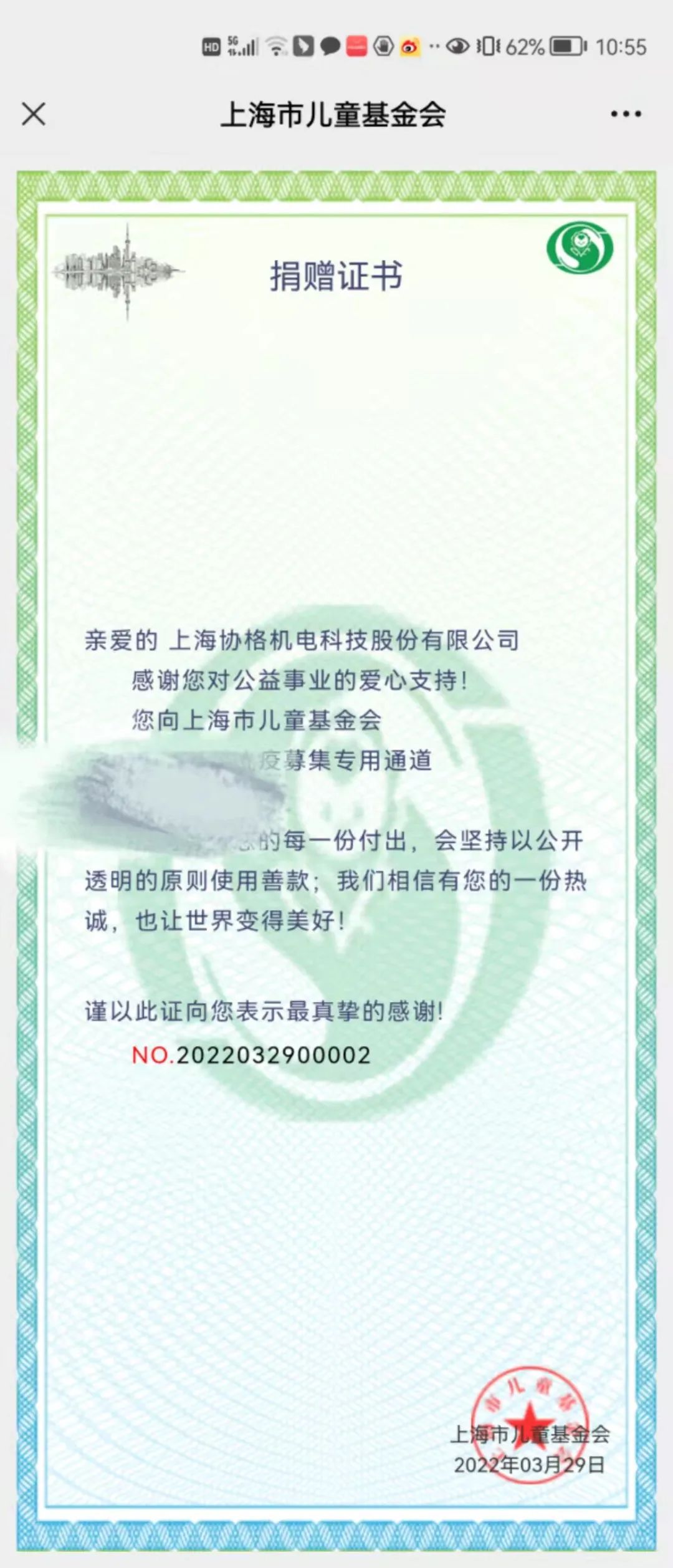 (上海協(xié)格為“上海市兒童基金會”捐贈證書)