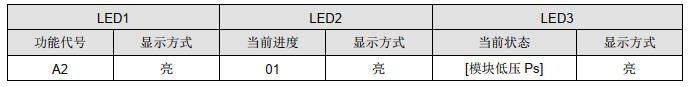 LED3顯示的為模塊的低壓值,如果為負(fù)值,LED3則每1秒循環(huán)顯示“負(fù)號(hào)”代碼“ nE”與數(shù)值表示。例如:-30度,先顯示“nE”, 1秒后顯示“30”,如此循環(huán)。