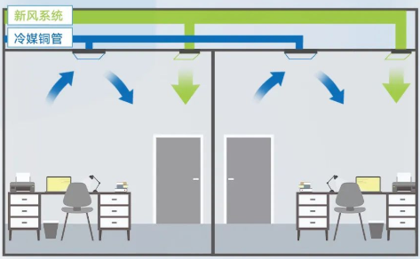 全冷媒系統(tǒng)是由獨(dú)立的室內(nèi)機(jī)進(jìn)行每個(gè)房間的冷暖處理,每臺(tái)室內(nèi)機(jī)通過(guò)封閉的冷媒回路和其所在的室外機(jī)模塊進(jìn)行熱量交換。不管是室內(nèi)側(cè)還是室外側(cè),一套冷媒系統(tǒng)不僅獨(dú)立而且機(jī)組容量相對(duì)較小,因此被感染風(fēng)險(xiǎn)極低。新風(fēng)也是由獨(dú)立的新風(fēng)系統(tǒng)送達(dá),可以采用帶有熱回收功能的全熱交換新風(fēng)設(shè)備,在向室內(nèi)輸送新風(fēng)的同時(shí),通過(guò)門(mén)窗向外排氣,保證室內(nèi)空氣流通。