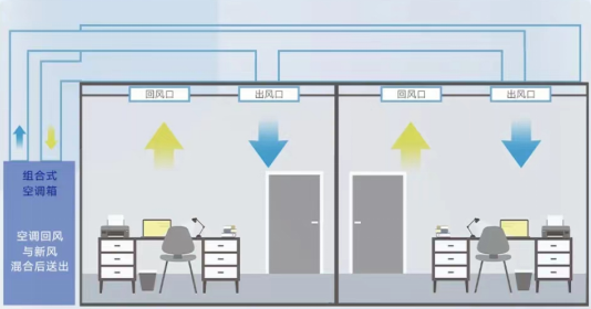 全水系統(tǒng)一般是由每個(gè)房間的風(fēng)機(jī)盤(pán)管進(jìn)行獨(dú)立的冷暖處理,新風(fēng)則由獨(dú)立的新風(fēng)系統(tǒng)送達(dá),因此,空氣只在室內(nèi)單個(gè)房間循環(huán),不會(huì)造成其他房間的交叉污染。但還需引入足夠的新風(fēng)保持室內(nèi)空氣流通,稀釋并排出房間里可能會(huì)出現(xiàn)的病毒,避免同一房間內(nèi)的二次感染。