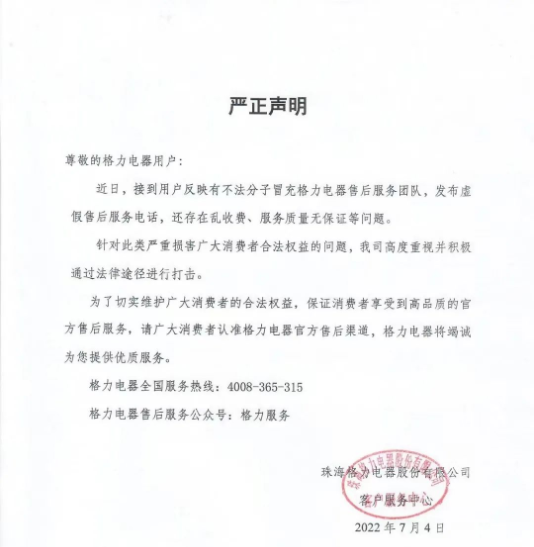 7月4日,格力電器發(fā)布聲明稱,近日接到用戶反映有不法分子冒充格力電器售后服務(wù)團(tuán)隊(duì),發(fā)布虛假售后服務(wù)電話,還存在亂收費(fèi)、服務(wù)質(zhì)量無保證等問題。