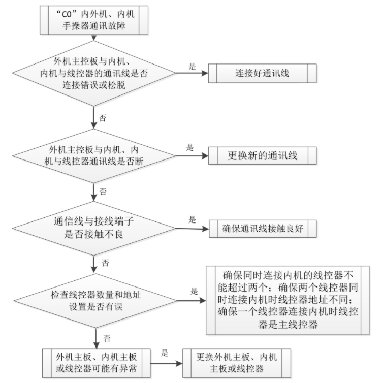 如果外機(jī)主控板沒(méi)有顯示C0,則檢查內(nèi)機(jī)與手操器之間的網(wǎng)絡(luò);如果外機(jī)主控板、內(nèi)機(jī)燈板和線控器全部報(bào)C0,則需要檢查內(nèi)外機(jī)之間、內(nèi)機(jī)與手操器之間的網(wǎng)絡(luò);如果只有線控器報(bào)C0,則檢查內(nèi)機(jī)與手操器之間的網(wǎng)絡(luò)以及線控器數(shù)量和地址設(shè)置。