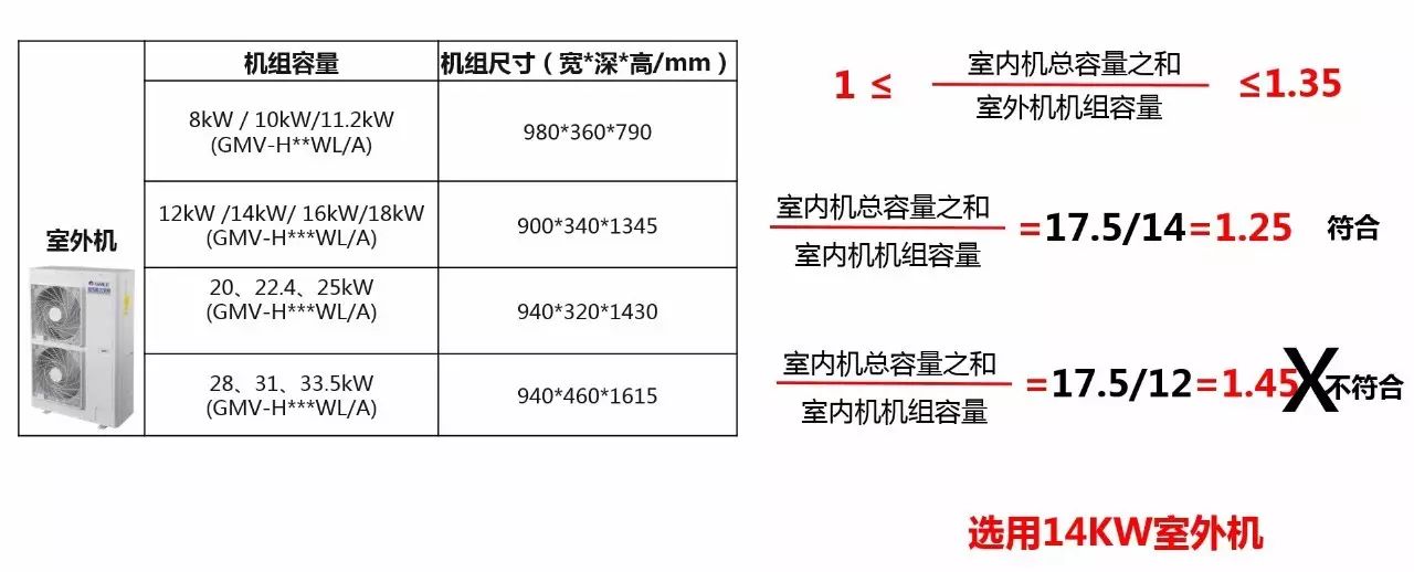 室內(nèi)機機組裝機總?cè)萘恐?7.5KW÷室外機機組容量小于等于1.35即可(如下圖1.2小于1.35),因此選用14KM室外機。