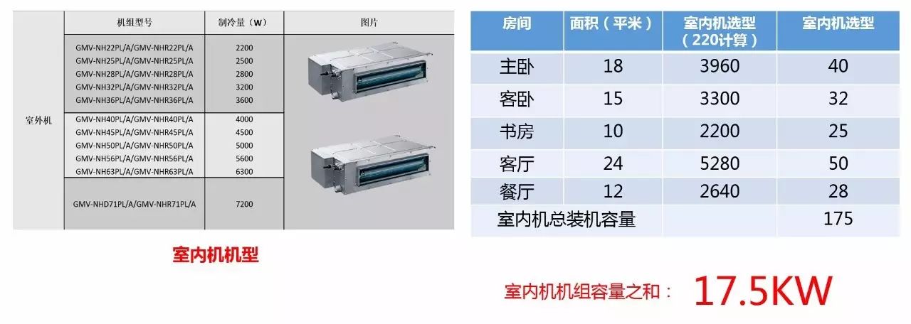 測算出顧客每個房間的實際面積之后,接下來我們根據(jù)房間面積x220W/平米,來計算此房間所需要的冷量,對著室內(nèi)機型號選定對應(yīng)室內(nèi)機機型。依次類推選出每個房間的機型,將所有選定的室內(nèi)機組裝機容量相加得出16.8kw.