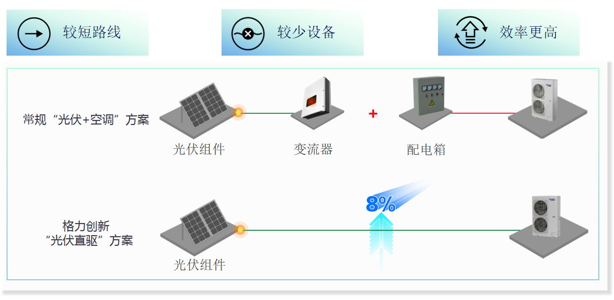 格力創(chuàng)新“光伏直驅”方案路徑短,系統(tǒng)效率高,清潔能源以Z短路徑驅動空調運行,光伏直驅利用率達99%,相比傳統(tǒng)方案,減少多次轉換,提高系統(tǒng)效率可達到8%的效率提sheng。