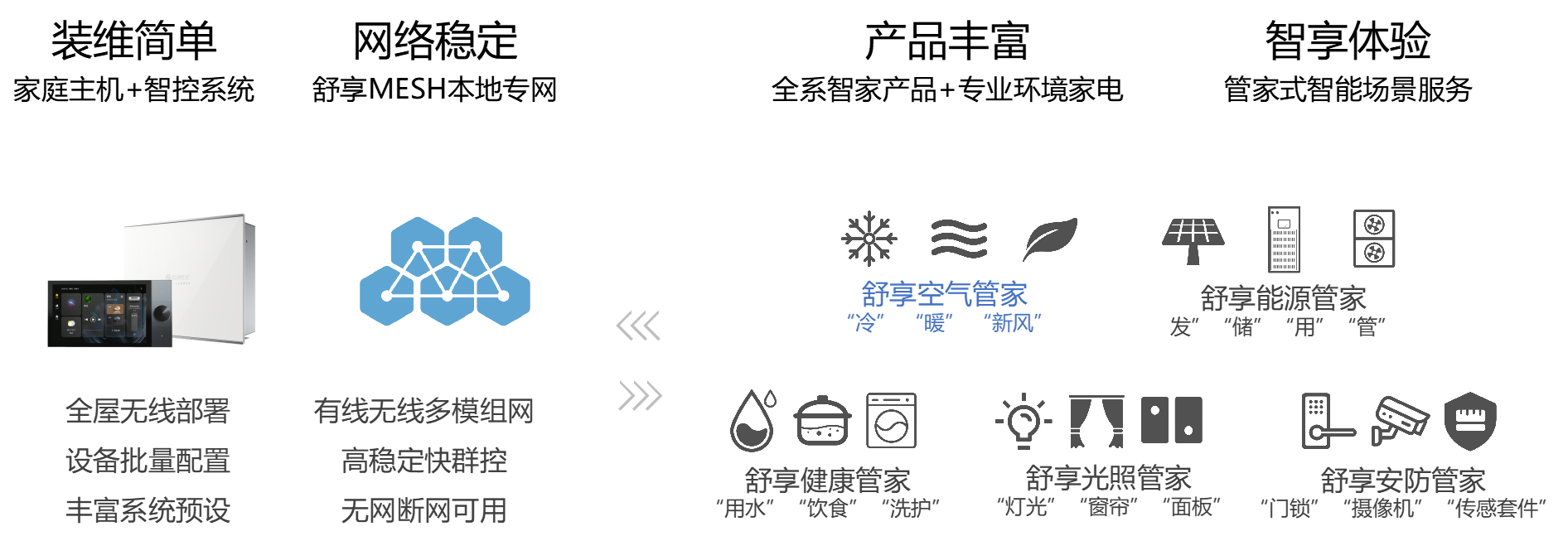 格力舒享家包含綠色能源、智慧生活、舒適環(huán)境三大業(yè)務板塊,涵蓋光(風)電、儲能、中央空調、地暖、新風、全屋家電、健康用水、智能家居八大系列產(chǎn)品,系統(tǒng)化打造綠色、健康的舒適家居環(huán)境。