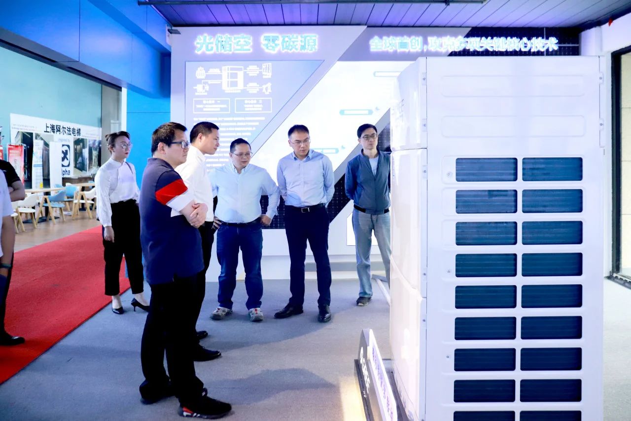 上?,F(xiàn)代建筑科技館領(lǐng)導(dǎo)一行在格力領(lǐng)導(dǎo)們的陪同下現(xiàn)場(chǎng)參觀了上海格力商用光伏新能源展廳,在上海格力商用部朱雄楓先生的講解下,詳細(xì)了解了格力光伏新能源技術(shù)的應(yīng)用。