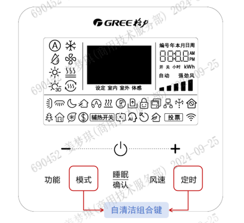 1.線控器cao作:空調(diào)開機或關(guān)機狀態(tài)下,同時按住遙控面板的“模式+定時”組合鍵約5秒鐘,即可開啟自清潔功能。若中途想退出該功能,按住“開關(guān)”鍵5秒鐘,或者重復(fù)按上述組合鍵cao作即可。