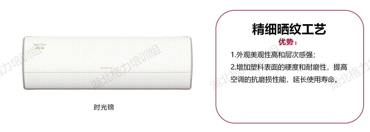 精細(xì)曬紋工藝為2024新冷年格力時光錦的面板。此類面板美觀性和層次感強;凹凸紋理面板增加塑料表面的硬度和耐磨性,提高空調(diào)抗磨損性能,使用時長更長。
