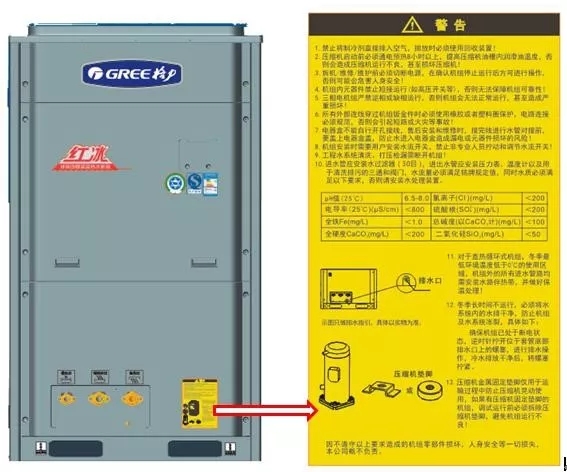 具體排水操作可以查看機(jī)組使用說(shuō)明書(shū)或者機(jī)組面板粘貼的警告標(biāo)識(shí)。