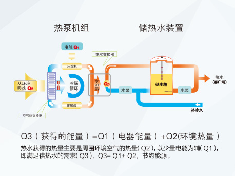 商用空氣能熱水器依據(jù)“逆卡諾”原理工作,以制冷劑為載體,將室外環(huán)境空氣的熱量,源源不斷的輸送到水側(cè)換熱器,再將熱量傳遞到水中,供給用戶以滿足生活熱水的需求。